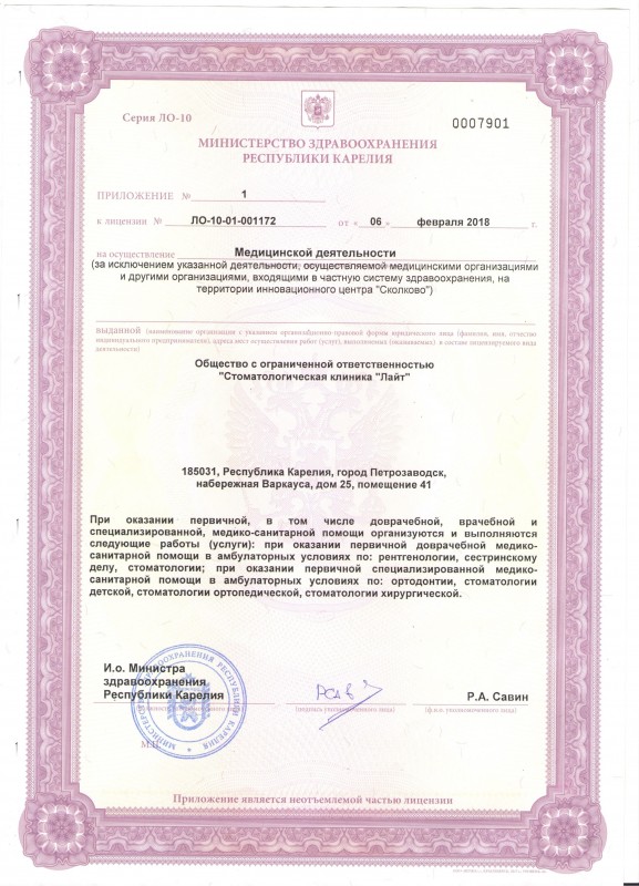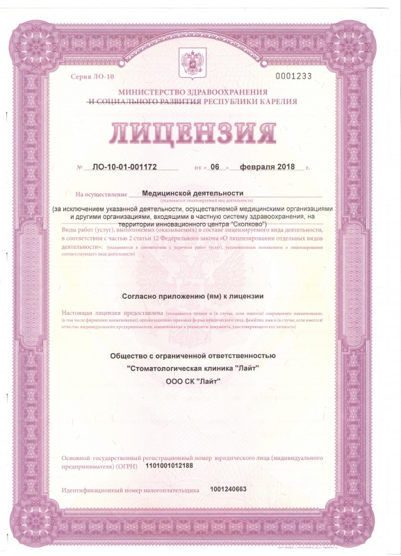 ООО Стоматологическая клиника "Лайт" информирует о возможности получения соответствующих видов и объемов медицинской помощи без взимания платы в рамках программы государственных гарантий бесплатного оказания гражданам медицинской помощи и территориальной программы государственных гарантий бесплатного оказания гражданам медицинской помощи. ООО Стоматологическая клиника "Лайт" услуги по полисам ОМС не оказывает.